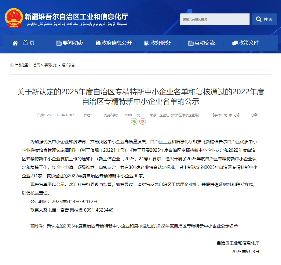 近日,新疆維吾爾自治區工業和信息化廳正式公布了2025年度自治區專精特新中小企業新認定名單。新疆華遠同創科技有限公司憑借專業的技術實力、精細的服務態度和創新的發展理念,成功通過“2025年度自治區專精特新中小企業”資質認定。